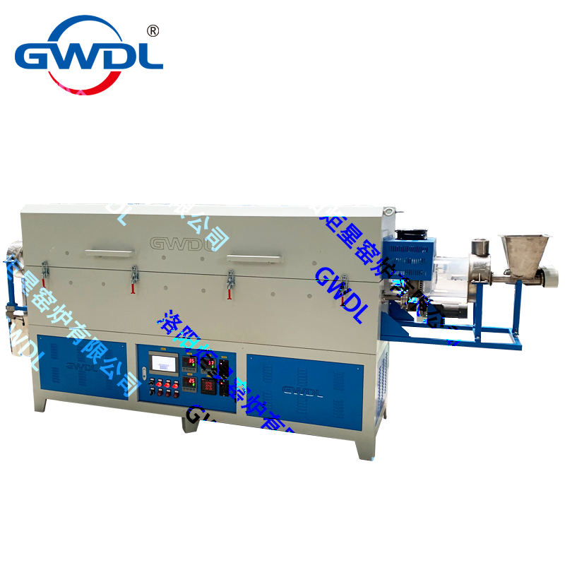 The furnaces are suitable for continuous material processing. It contains a screw feeder and a material collection barrel. Residence time in the heated zone depends on the degree of inclination and the rotating speed (which can be controlled by the customer) and the length of the working tube, in addition to the flow properties of the material. The design of the split furnace, drive system, and feeder/ collection assemblies allows the work tube to be easily removed and replaced.